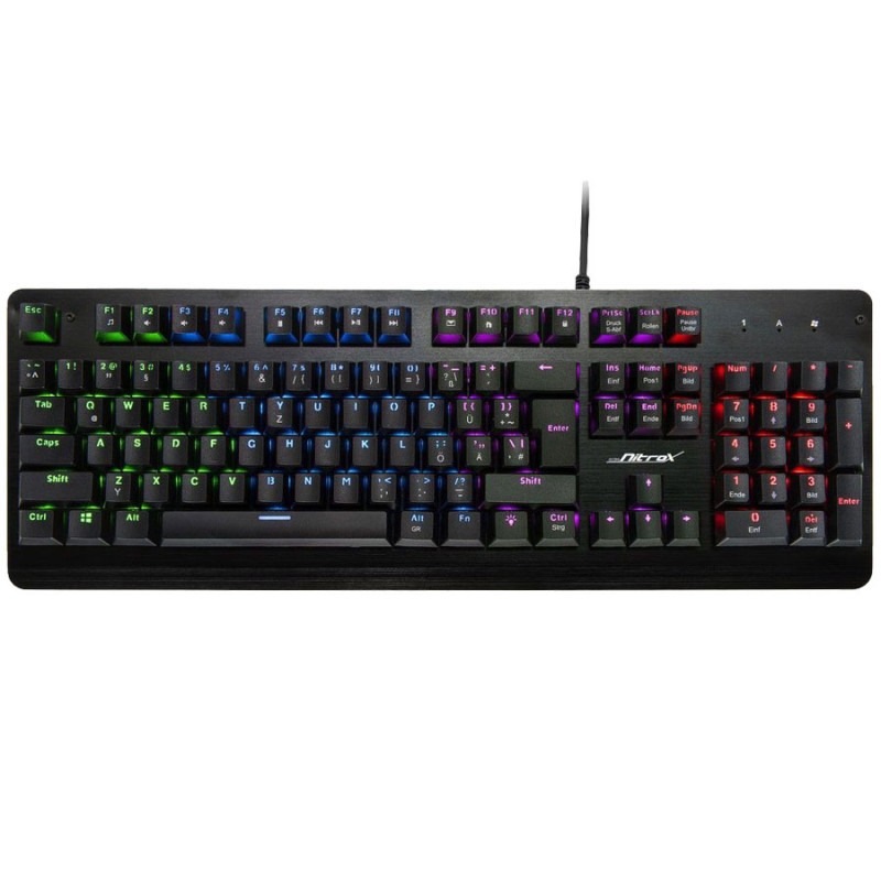 Clavier Gamer NITROX NK.2000ME . Rétro.éclairé RVB . Technologie de Connectivité: Filaire . Interface: USB 2.0 . Nombre de touches: 104 Touches dont 11 Touches multimédias . Normes de Clavier: QWERTY / QWERTZ . Interrupteur à déclic Huano de haute qualité . Survol de clé: 26 . Durée de vie clé: juqu’à 20 000 de frappes . Frappe: 60 ± 10g . Longueur de câble: 160 cm . Surface en aluminium poli . Tension de fonctionnement: 5V . Systèmes d’exploitation requis: Windows XP , 7 , 8 , 10 , MAC OS et Linux . Dimensions: 38,5 x 442,5 x 178 mm . Poids: 870 g . Garantie: 1 an
