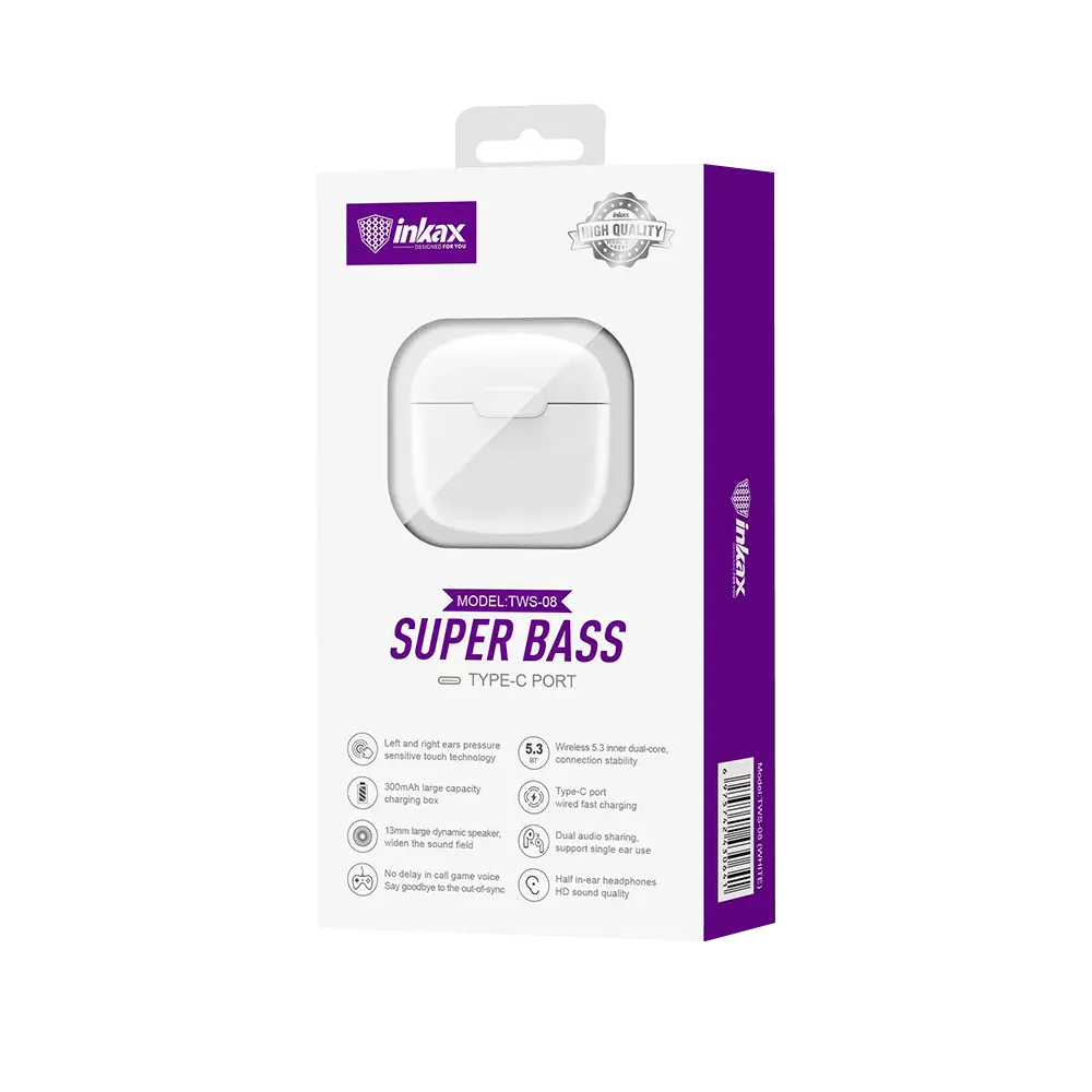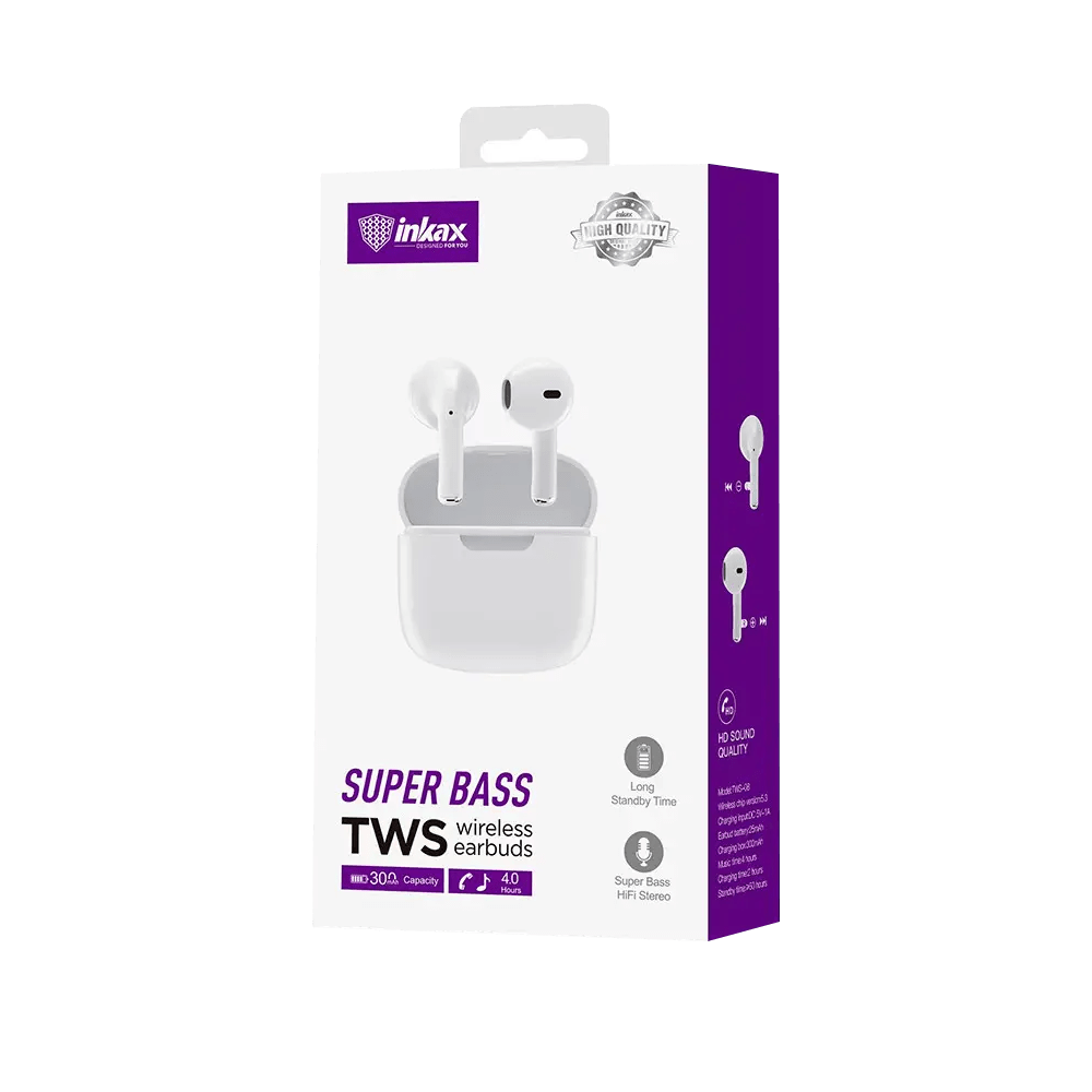 Écouteur Sans Fil INKAX TWS-08 – Technologie de connectivité: Bluetooth 5.3 – contrôleur avec touche – Suppression active du bruit – Batterie : 300mah, 3.7V – Distance de transmission: 10 mètres – Capacité de la batterie: 30mAh / 250mAh – Temps de charge: environ 3 heures – Temps de lecture / conversation: environ 4 heures – Autonomie en veille: 60 heures – Avec microphone: Oui – Contrôle du volume: Oui – type-c port – Couleur: Blanc
